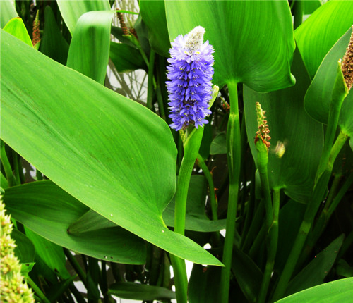梭鱼草的生长习性为喜温暖湿润、光照充足的环境条件,常栽于浅水池或塘边,其叶色翠绿,花色迷人,花期较长,可用于家庭盆栽、池栽,也可广泛用于园林美化,栽植于河道两侧、池塘四周、人工湿地,与千屈菜、花叶芦竹、水葱、再力花等相间种植,每到花开时节,串串紫花在片片绿叶的映衬下,别有一番情趣。是一种较有前途的水生观赏植物。